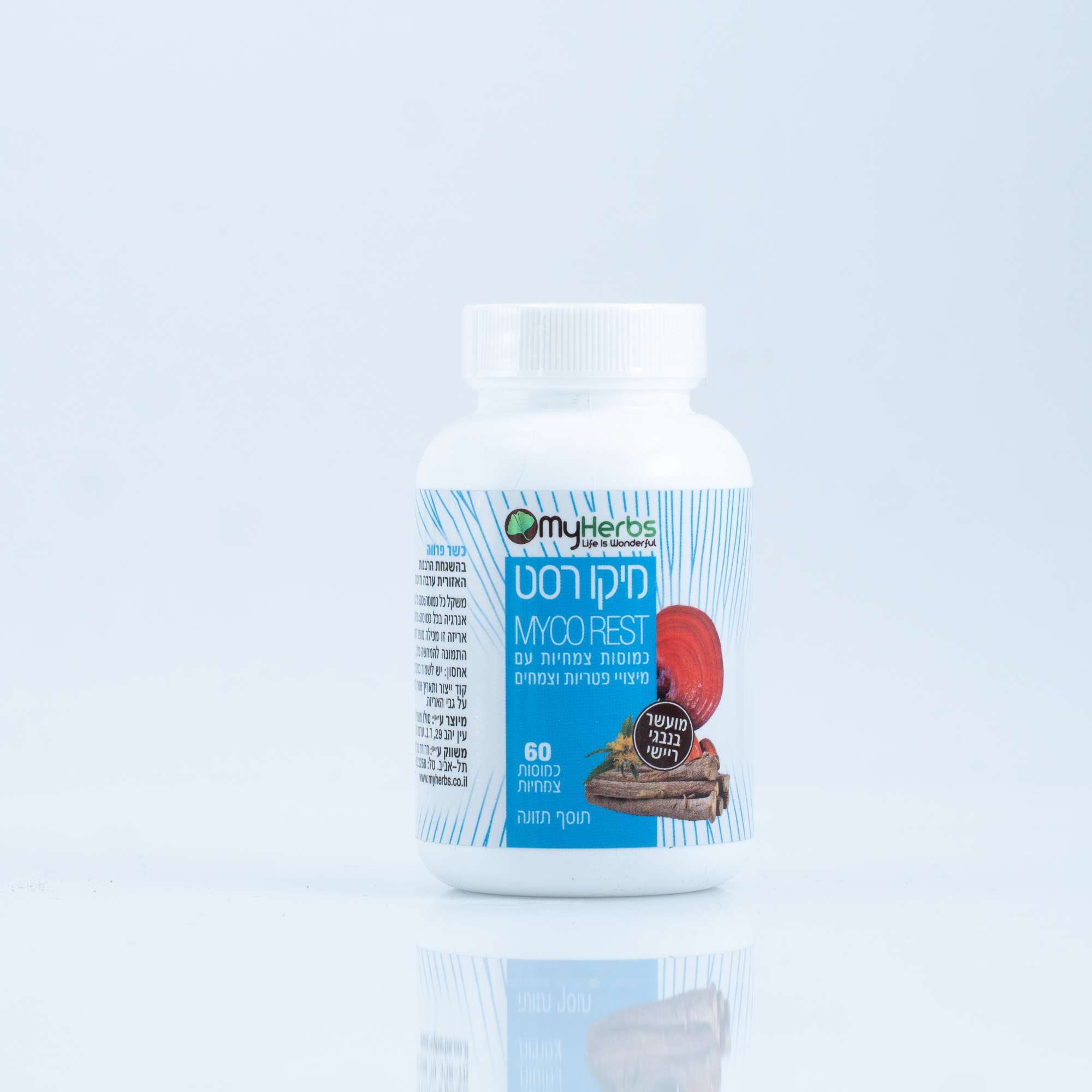 פטריות מרפא להרגעה, מיקו רסט Myco Rest מבית MyHerbs, מכילה שילוב סינרגטי ייחודי של פטריית מרפא ריישי, נבגי ריישי, צמח רודיולה וצמח אשווגנדה שהוכחו מחקרית כיעילים בהפחתת רמות מתח.